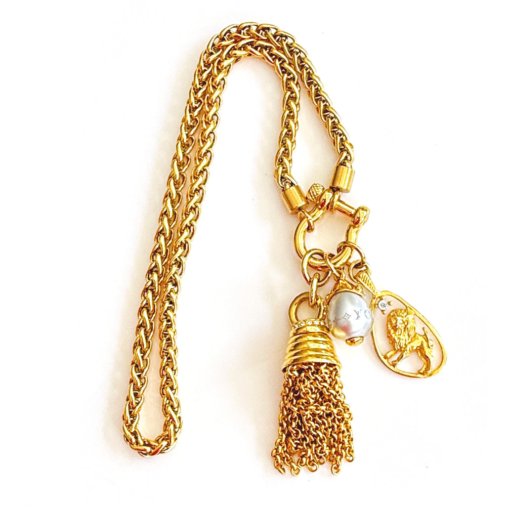Louis Vuitton Pearl Charm, Vintage Rhinestone Tassel and Vintage Lion Leo Crystal Accent Charm Statement Necklace
