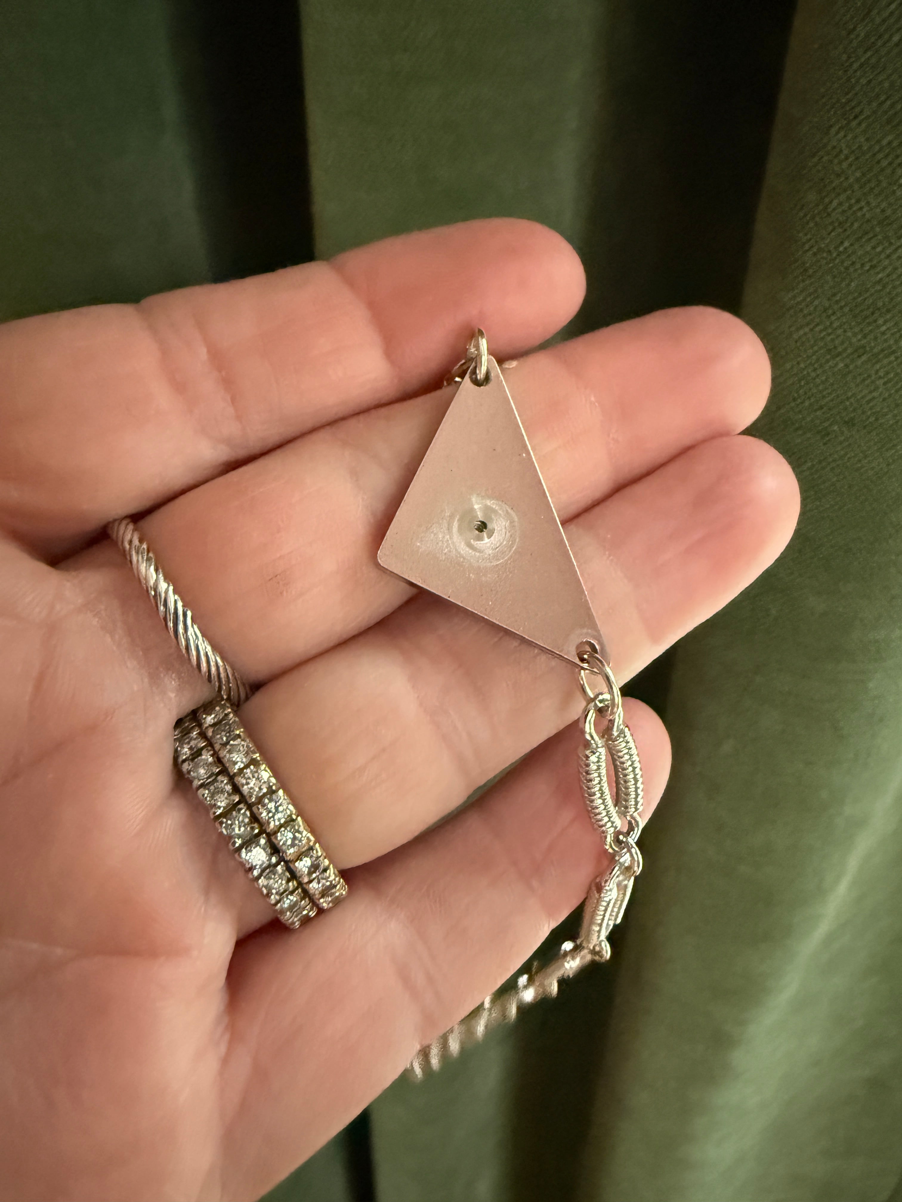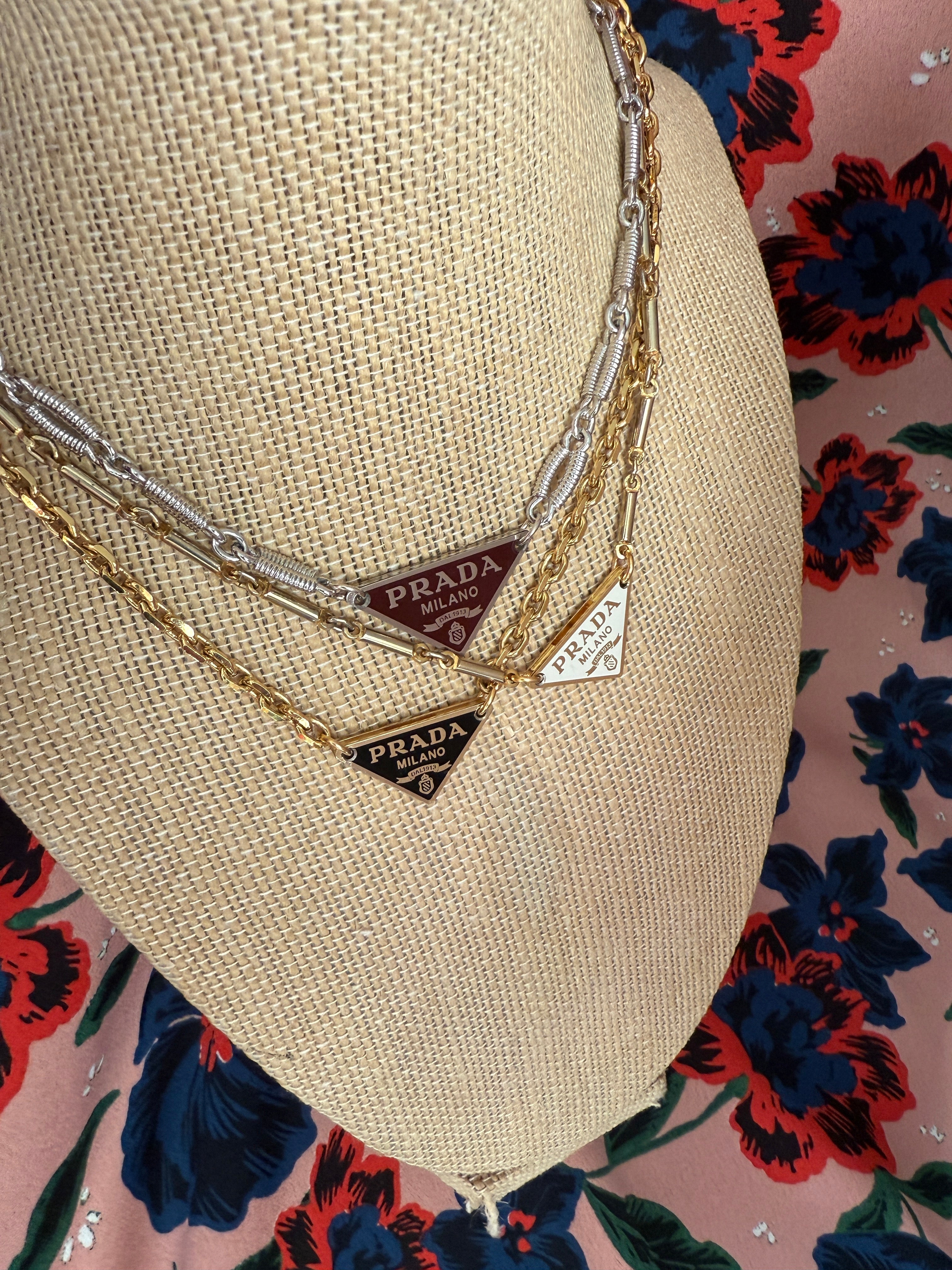 **A medium brown and silver repurposed Prada triangle shaped charm with Prada written in the middle and Milano written below it