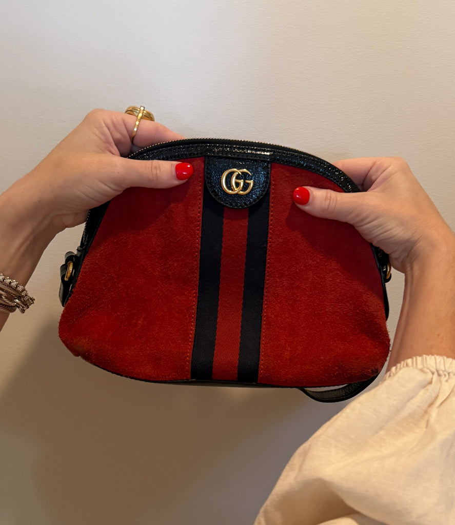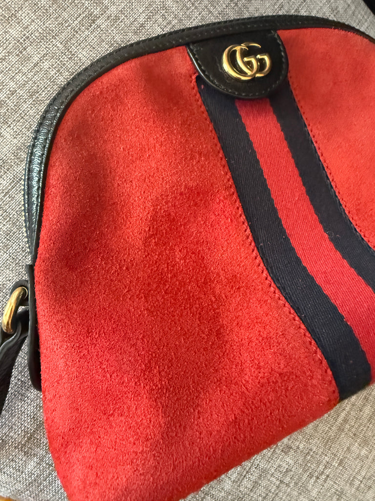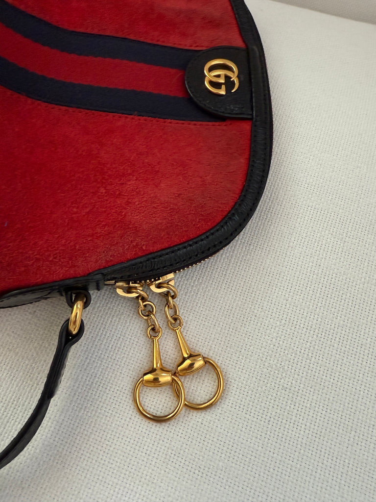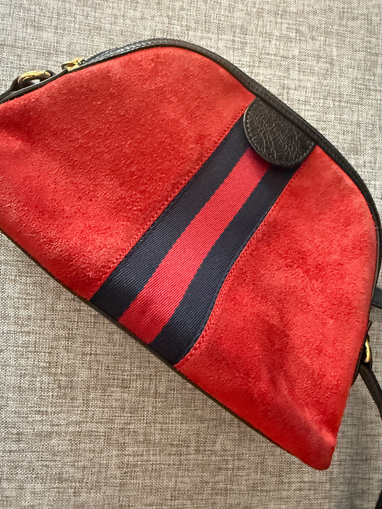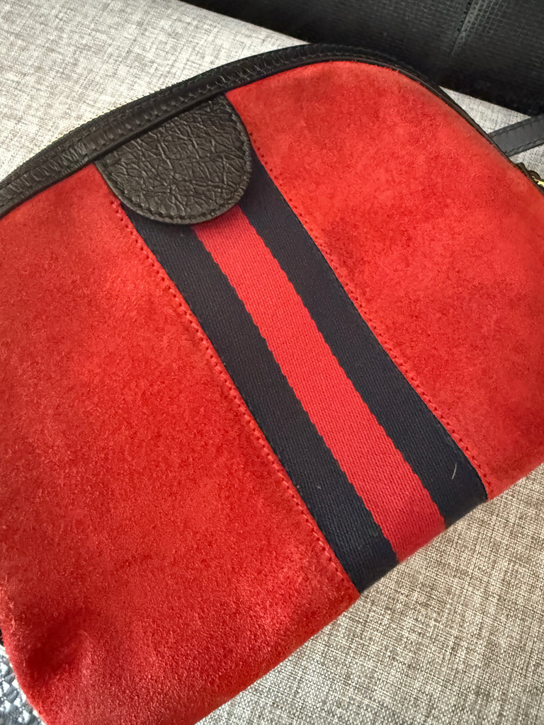 **Red suede material, leather trim, web accent with double G gold Logo