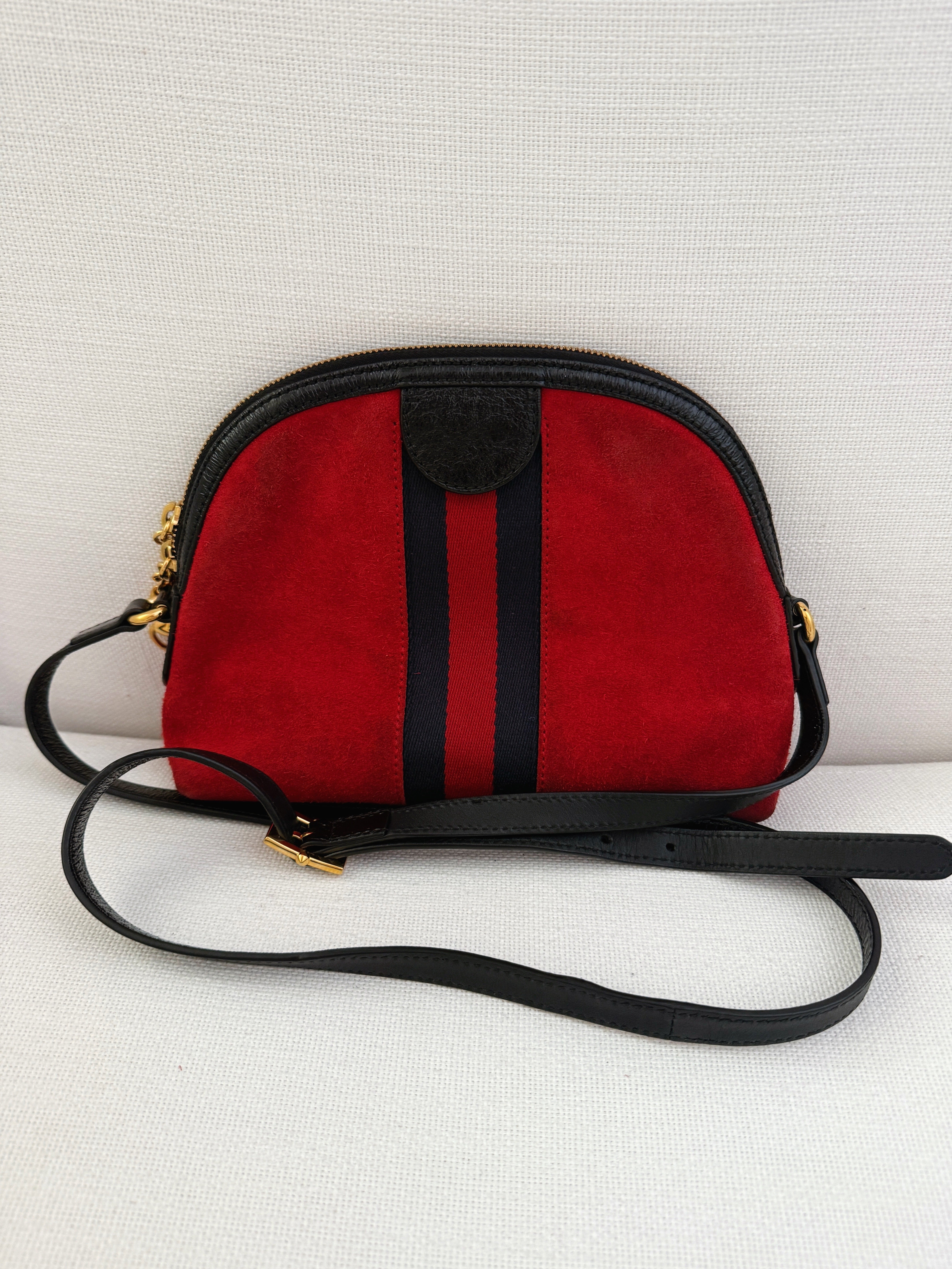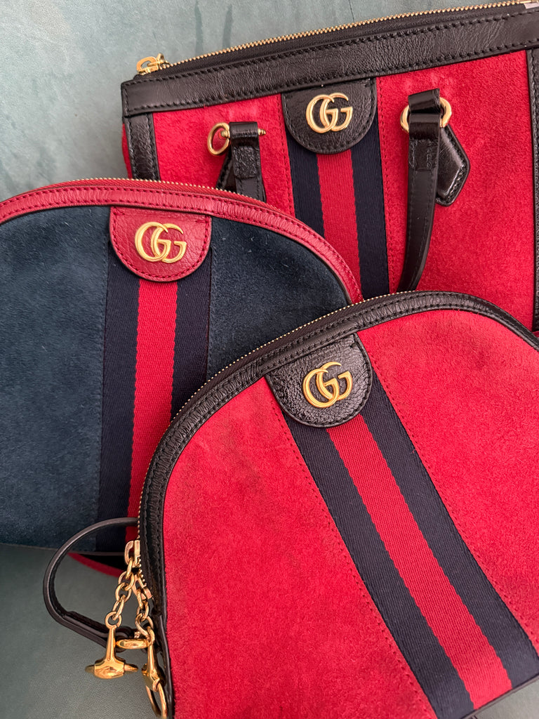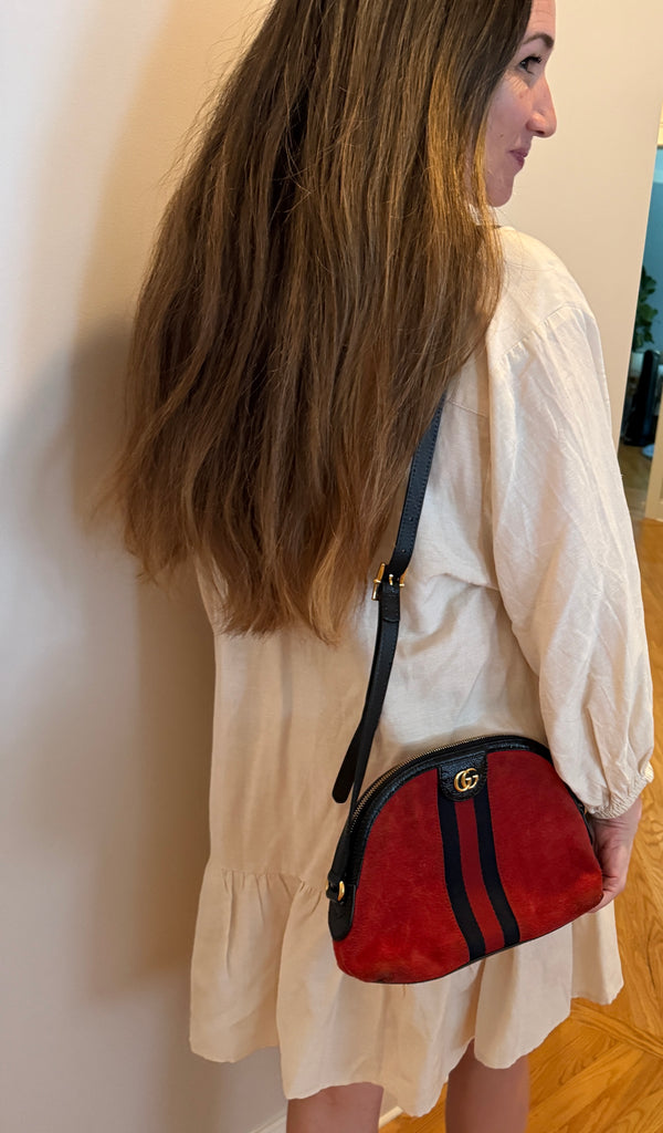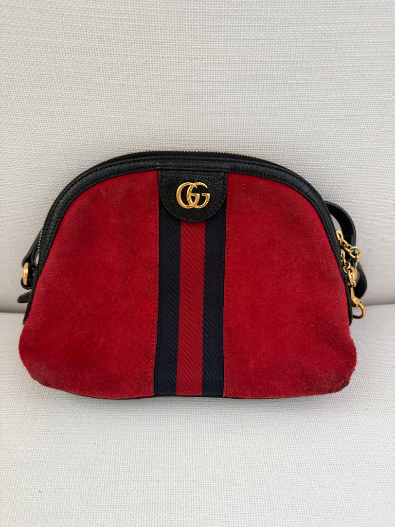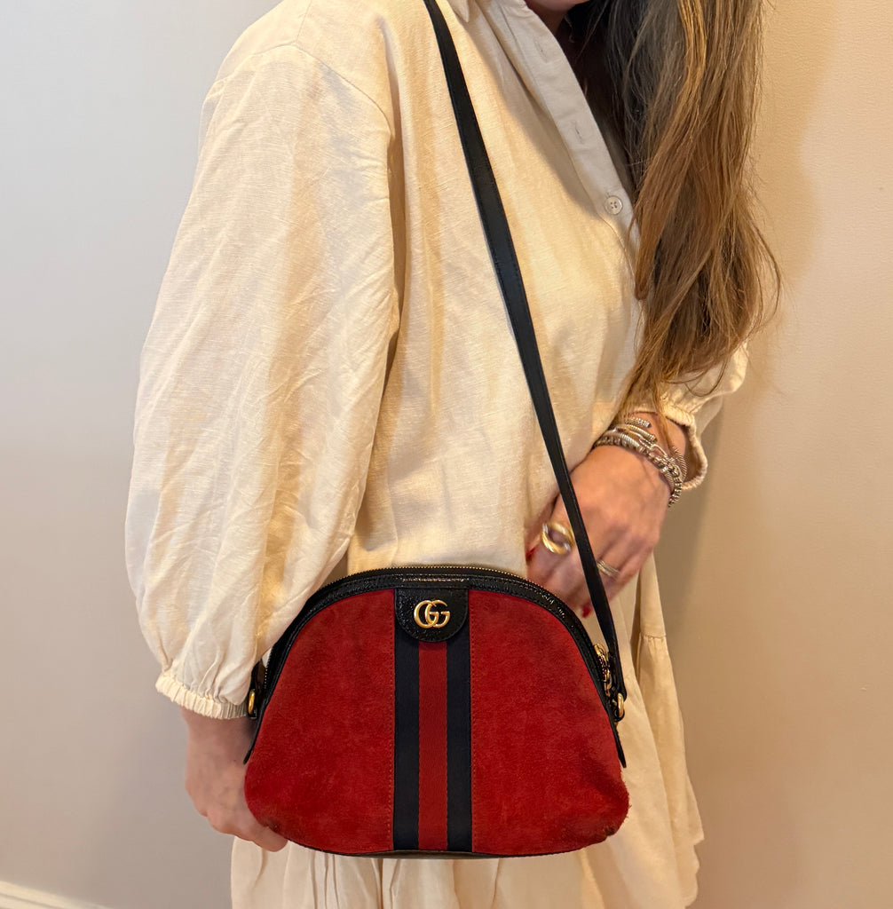 **Red suede material, leather trim, web accent with double G gold Logo