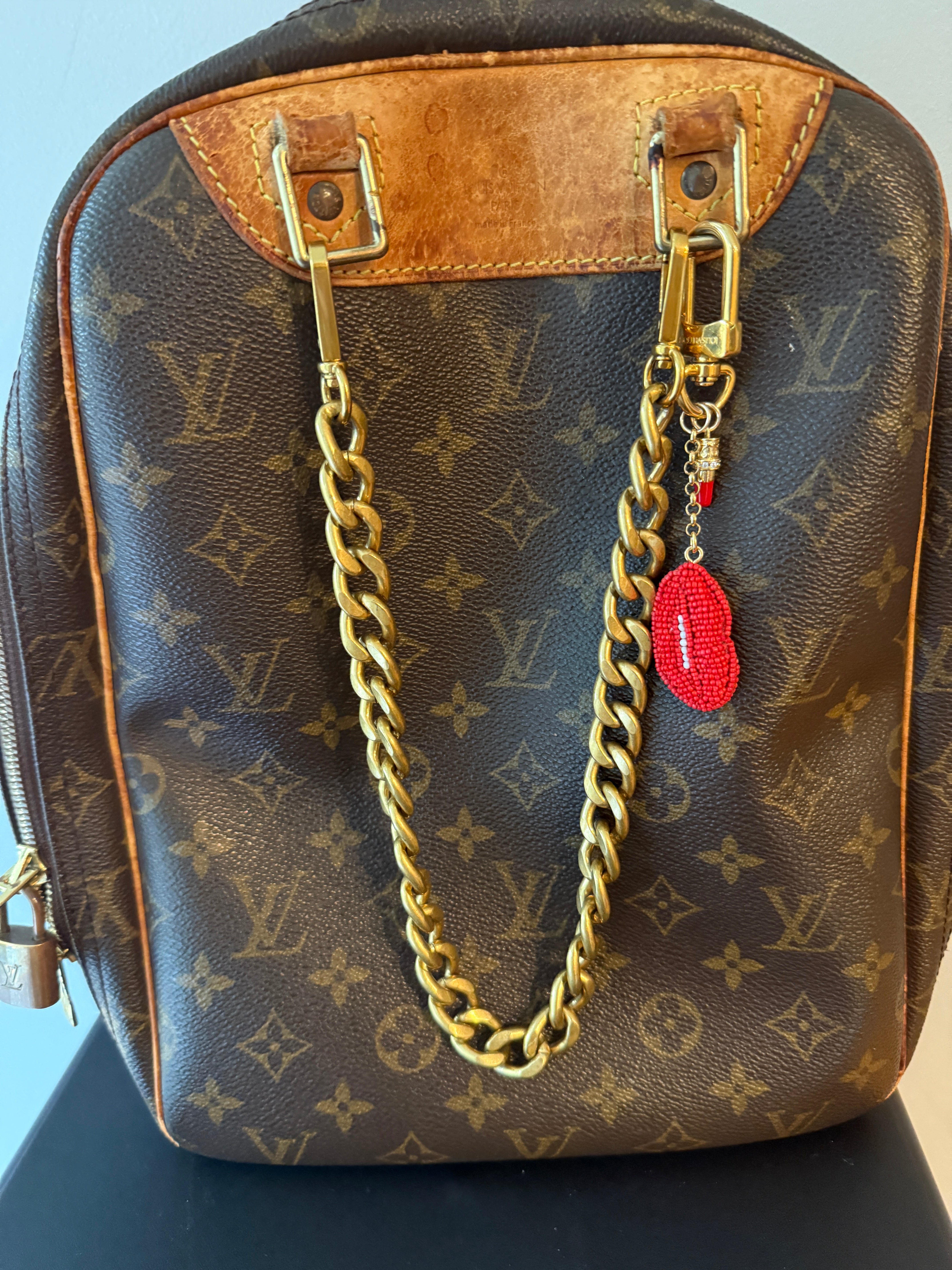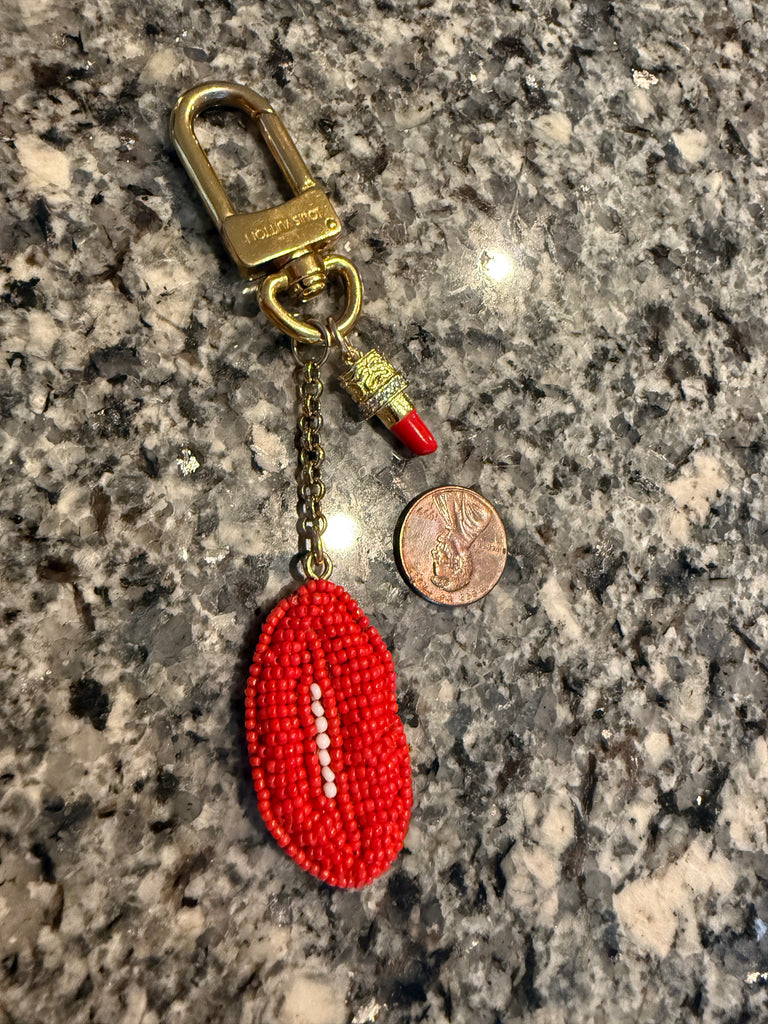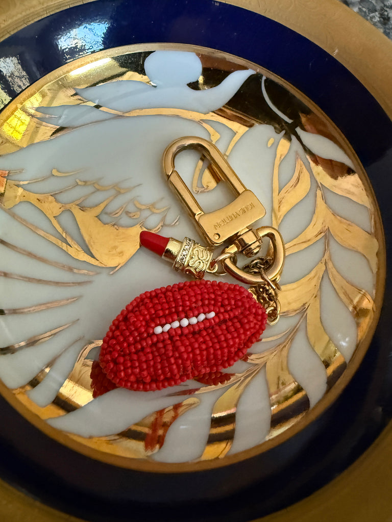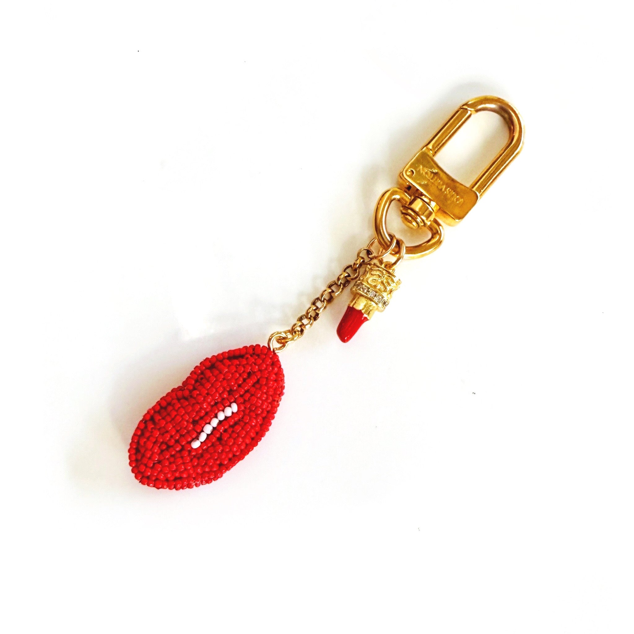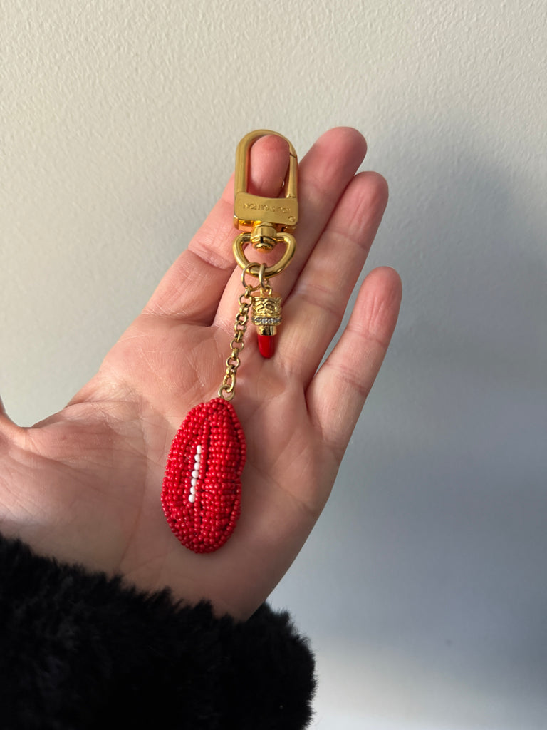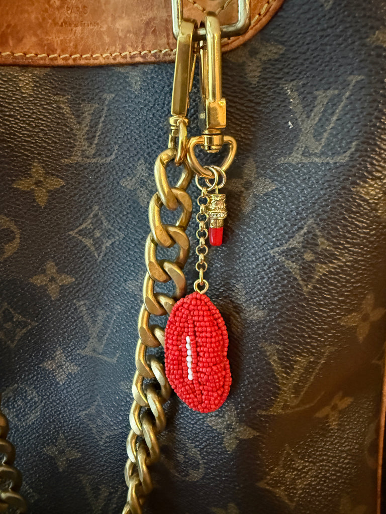 Beaded Red Lips and Lipstick Charm and Gold Louis Vuitton Bag Charm