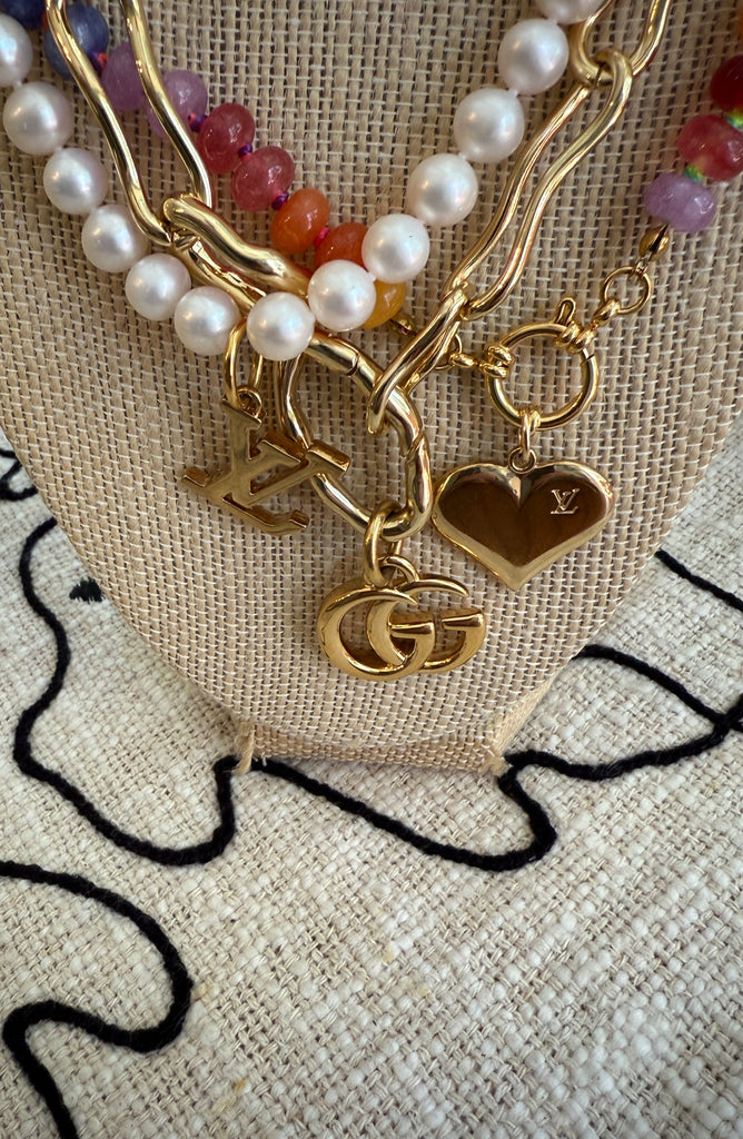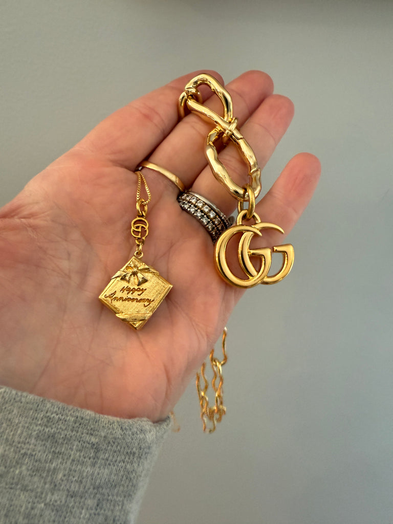 **A large gold plated cutout Gucci charm with signature GG logo in center
