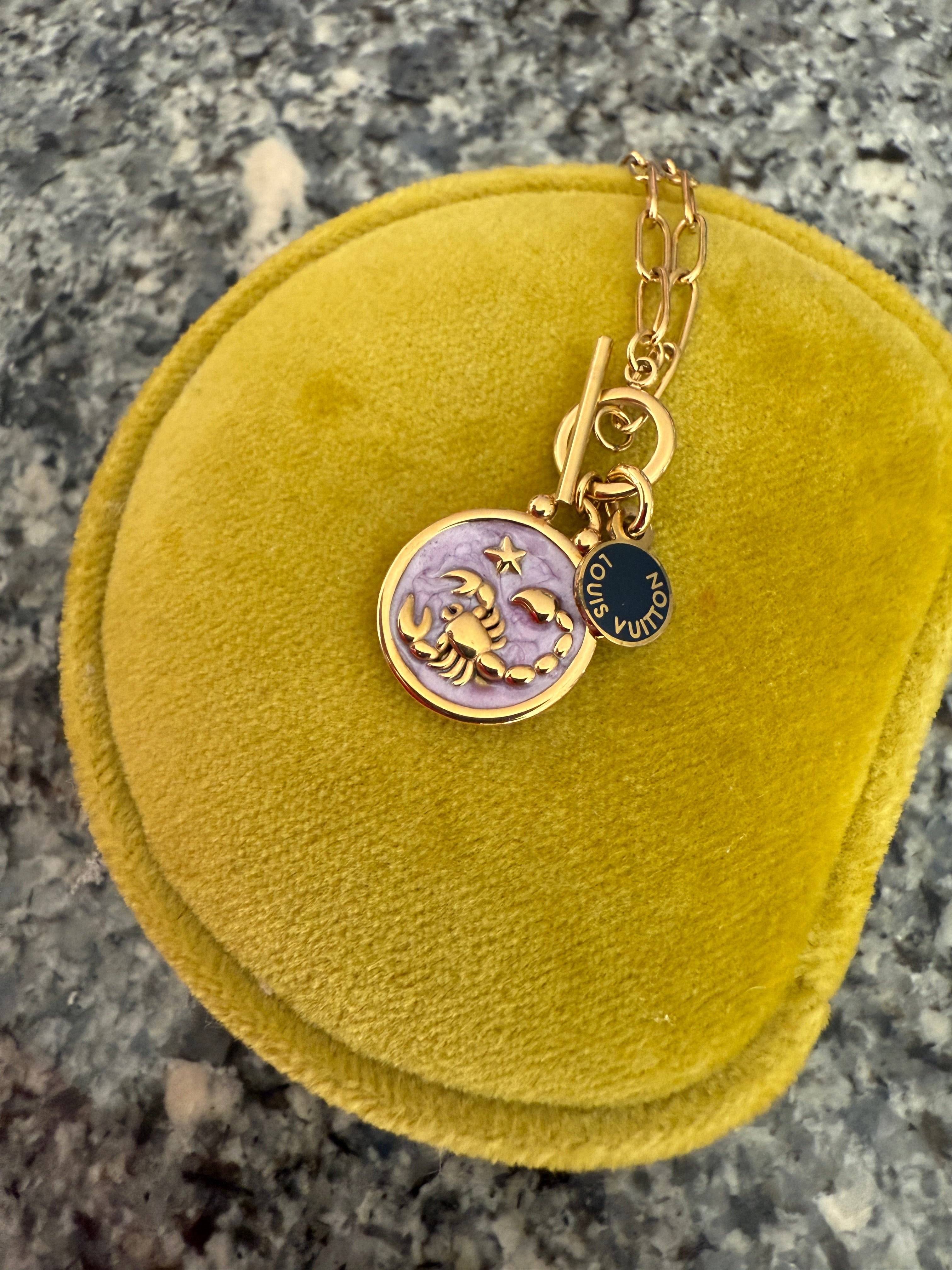 Tiny Blue Louis Vuitton Charm and Small Purple and Gold Scorpio Charm Necklace