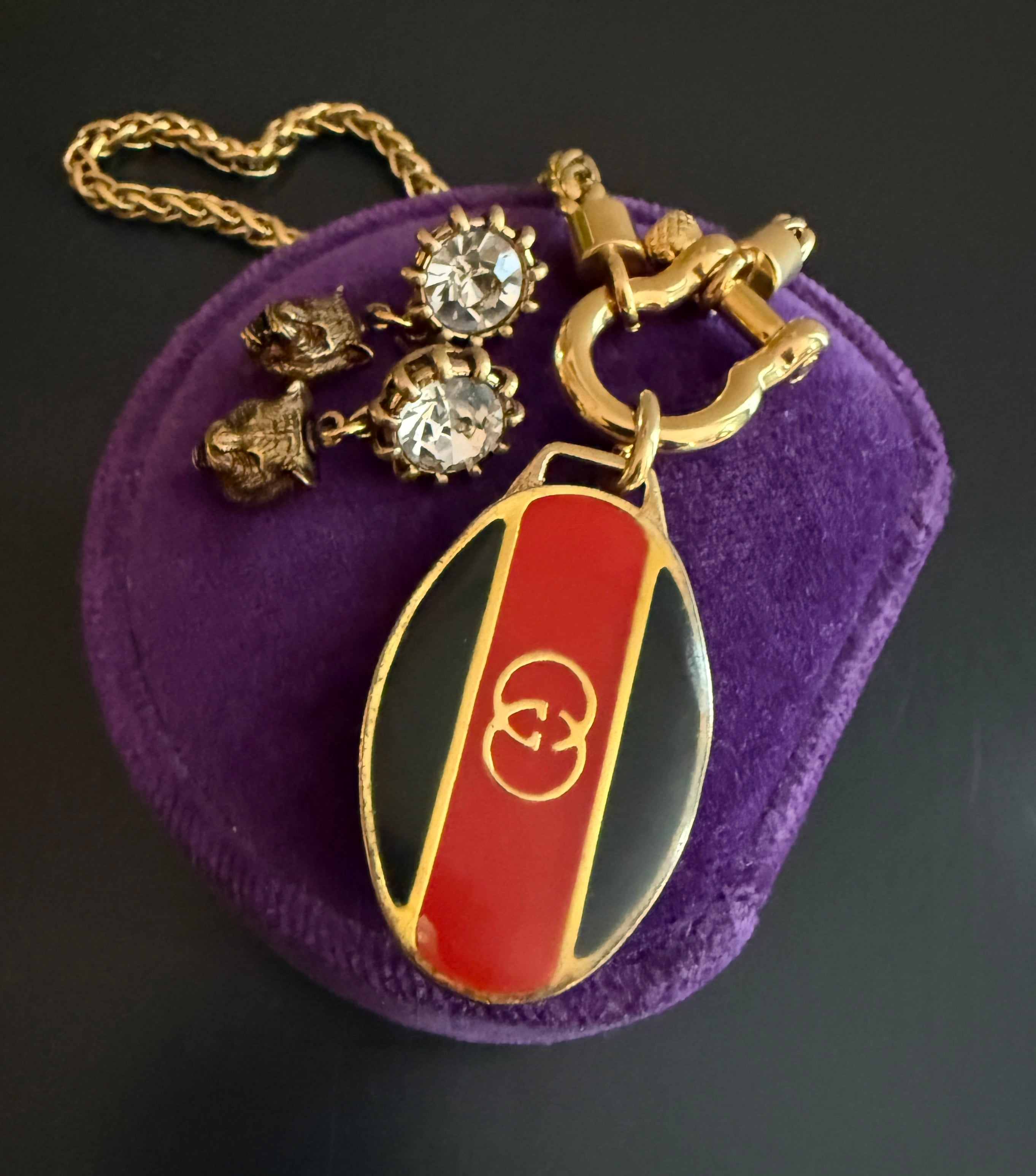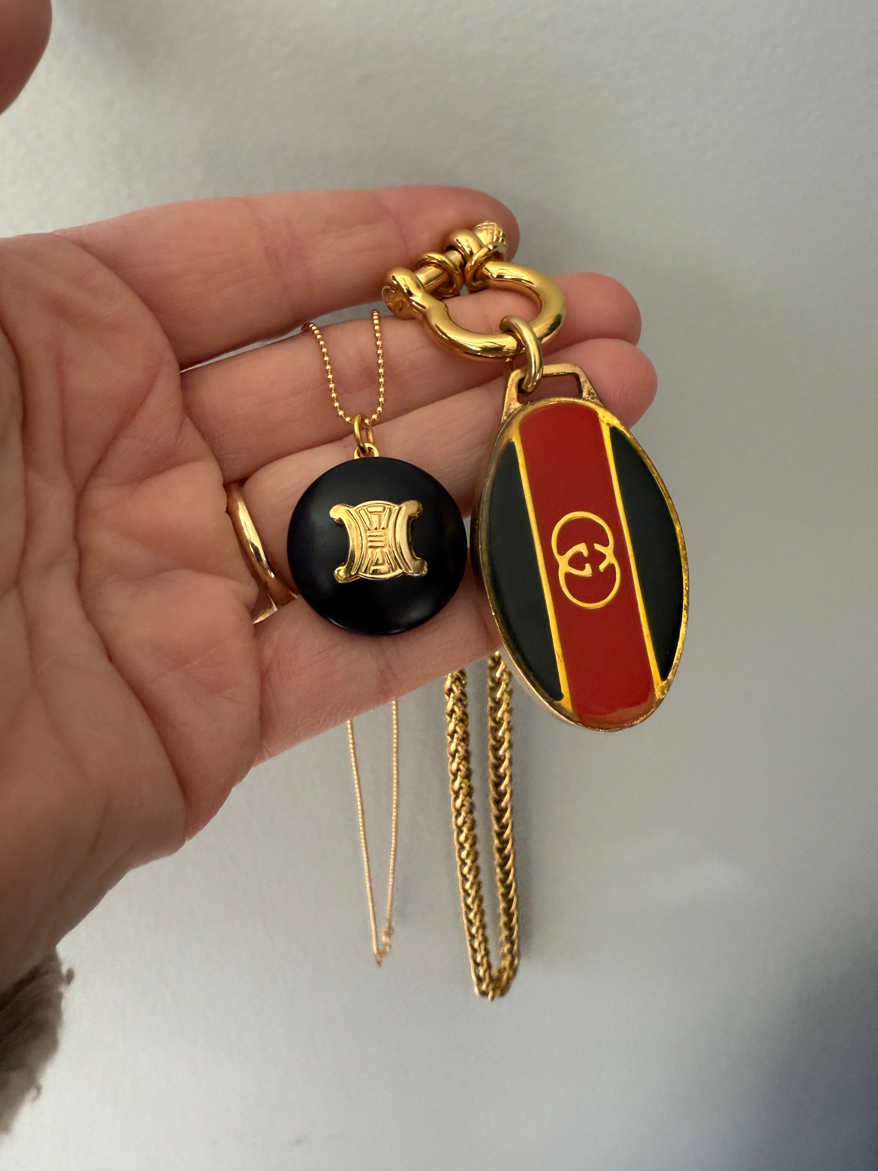 **A huge vintage black and red enamel and gold colored Gucci oval shaped charm with signature GG (double sided)